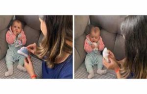 Mais uma atividade proposta é, em um ambiente com baixa luminosidade, colocar um feixe de luz (com uma lanterna ou o celular) atravessando horizontalmente o bebê na altura do peito para que ele tente controlar os braços ao buscar o feixe de luz.