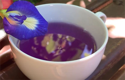 A flor da clitória (Clitoria ternatea) é muito utilizada na forma de chá. Especialmente a de cor azul devido a liberação de seu pigmento, porque além proporcionar bem-estar, o azul faz desse chá uma bebida linda.