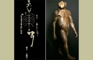 Montagem de fotos mostra o esqueleto de Lucy e um modelo tridimensional do Australopithecus afarensis — Foto: University of Texas at Austin via AP/AP Photo/Pat Sullivan
