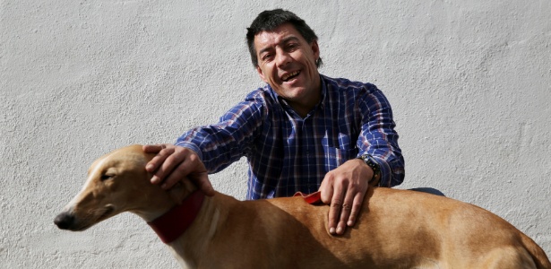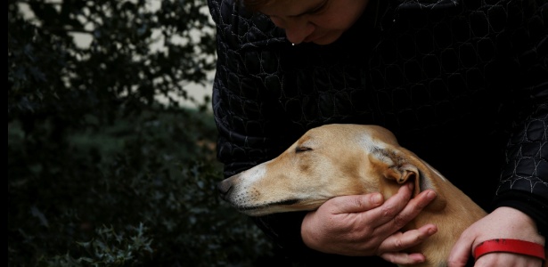 Miren Martinez, 49, faz carinho no cão Atila