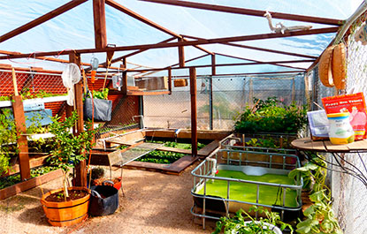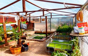 O sistema fornece frutas, verduras, legumes, peixe, frango, leite de cabra entre outras coisas. Aliás, são as galinhas as responsáveis por fertilizar o cultivo. As fezes caem através de uma malha de arame e ficam armazenadas na piscina, nutrindo as algas, que servem de alimento para as tilápias. O excremento dos peixes é rico em nitrogênio e essa água é canalizada para abastecer o sistema de hidroponia.