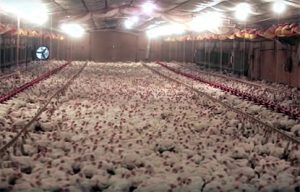 As galinhas, que pesam até quatro quilos, muitas vezes se curvam sob seu peso e vivem sem a luz solar. Elas frequentemente morrem antes de chegarem à maturidade e muitas são cobertas por suas próprias fezes, transformando os armazéns em locais suscetíveis à propagação de doenças.