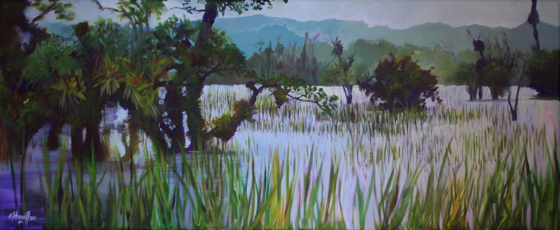 A pintora Kitty Harvill e a ornitóloga Bianca Reinert. Atrás, as obras de Kitty retratando a reserva bicudinho-do-brejo. Foto: Divulgação.