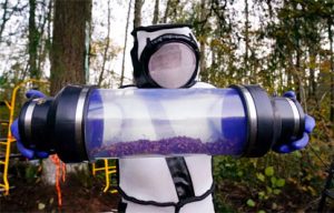 Os insetos foram aspirados da cavidade de uma árvore . Trajes especiais utilizados pelas equipes evitam que os ferrões de 6 milímetros das vespas machuquem os trabalhadores, que também usavam protetores faciais porque as vespas presas podem cuspir veneno doloroso em seus olhos.