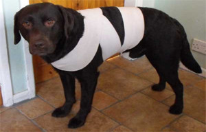 Amarre seu cachorro de forma que a faixa englobe peito e dorso (formando um oito), finalize dando um nó na região traseira, mas certifique-se que não esteja exatamente sobre a coluna.