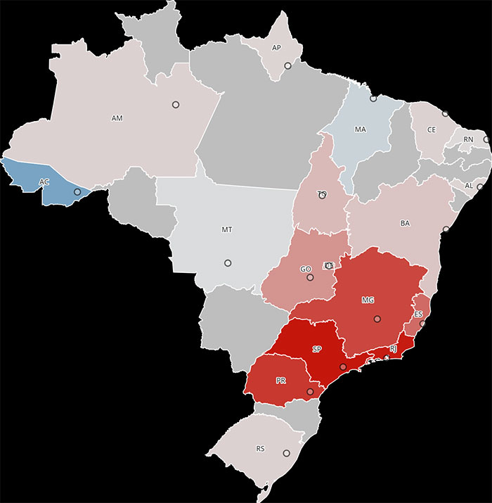 No mapa acima, as partes em laranja e vermelho indicam calor excessivo — quando mais escuro, mais quente. E em azul, as áreas em que houve temperaturas mais baixas que o esperado.